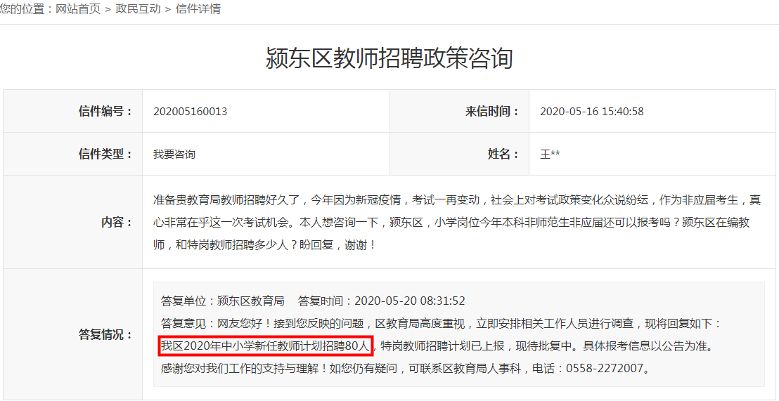 內(nèi)容:準備貴教育局教師招聘好久了,今年因為新冠疫情,考試一再變動,社會上對考試政策變化眾說紛紜,作為非應屆考生,真心非常在乎這一次考試機會。本人想咨詢一下,潁東區(qū),小學崗位今年本科非師范生非應屆還可以報考嗎?潁東區(qū)在編教師,和特崗教師招聘多少人?盼回復,謝謝!答復情況: