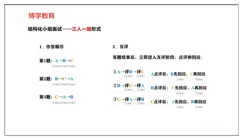 (1)結(jié)構(gòu)化小組互評(píng):15分鐘場(chǎng)外備考看題,進(jìn)入考場(chǎng)后,按要求每人依次答題,每道題目3分鐘(注:個(gè)人答題時(shí)間:2020年—2021年均為3分鐘,2018年—2019年均為2分鐘);全部答題結(jié)束,按要求展開互評(píng),點(diǎn)評(píng)每人的時(shí)間為2分鐘;被點(diǎn)評(píng)人針對(duì)點(diǎn)評(píng)展開回應(yīng),時(shí)間2分鐘。