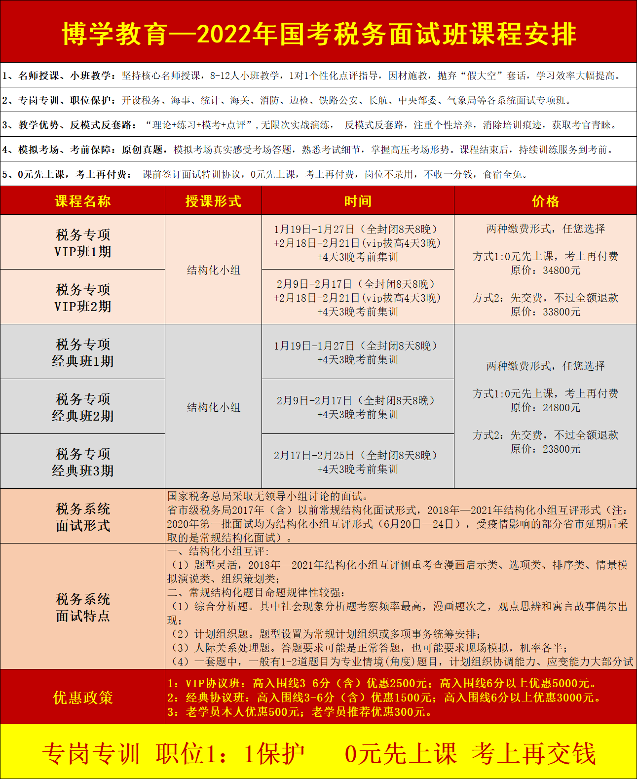 稅務局面試形式和特點 面試形式:國家稅務總局采取無領導小組討論的面試。 省市級稅務局2017年(含)以前常規(guī)結構化面試形式,2018年—2021年結構化小組互評形式(注:2020年第一批面試均為結構化小組互評形式(6月20日—24日),受疫情影響的部分省市延期后采取的是常規(guī)結構化面試)。 面試題量:結構化小組互評每套題3道題目;常規(guī)結構化面試每套題4道題目。 面試時間: (1)結構化小組互評:15分鐘場外備考看題,進入考場后,按要求每人依次答題,每道題目3分鐘(注:個人答題時間:2020年—2021年均為3分鐘,2018年—2019年均為2分鐘);全部答題結束,按要求展開互評,點評每人的時間為2分鐘;被點評人針對點評展開回應,時間2分鐘。 (2)常規(guī)結構化面試:4道題目20分鐘,剩余3分鐘提醒時間。 (3)無領導討論:20分鐘場外備考看材料,然后進入考場總時間85分鐘,首先個人陳述每人3分鐘,然后根據問題展開自由討論,最后推選一個代表作5分鐘陳述總結。 考查方式:看題+聽題相結合的 面試試題特點 第一、結構化小組互評: (1)題型靈活,2018年—2021年結構化小組互評側重考查漫畫啟示類、選項類、排序類、情景模擬演說類、組織策劃類; 第二、常規(guī)結構化題目命題規(guī)律性較強: (1)綜合分析題。其中社會現象分析題考察頻率最高,漫畫題次之,觀點思辨和寓言故事偶爾出現; (2)計劃組織題。題型設置為常規(guī)計劃組織或多項事務統籌安排; (3)人際關系處理題。答題要求可能是正常答題,也可能要求現場模擬,機率各半; (4)一套題中,一般有1-2道題目為專業(yè)情境(角度)題目,計劃組織協調能力、應變能力大部分試題為國稅專業(yè)情境題,綜合分析有少量的國稅專業(yè)角度題目,總體難度不大。
