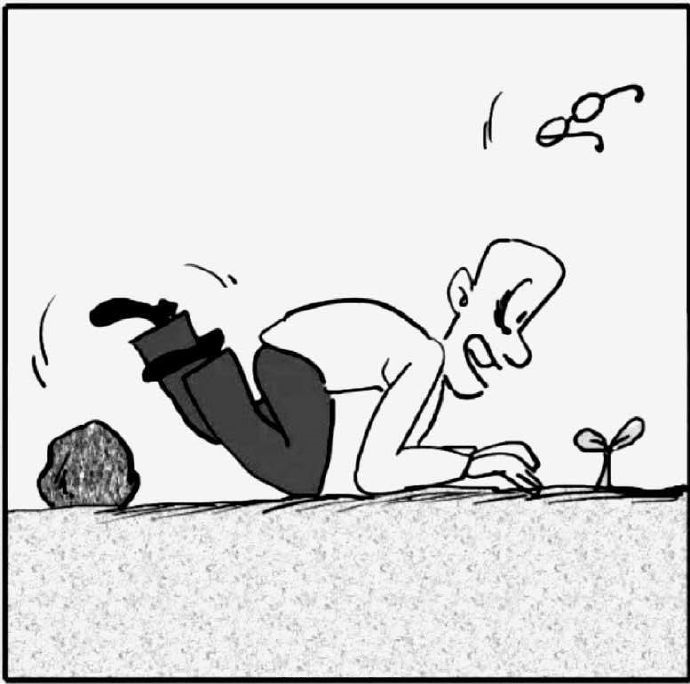 2、漫畫(huà)題:一個(gè)人被一塊石頭絆倒,眼鏡跌飛,眼睛緊盯著一個(gè)小樹(shù)苗。(如下圖)