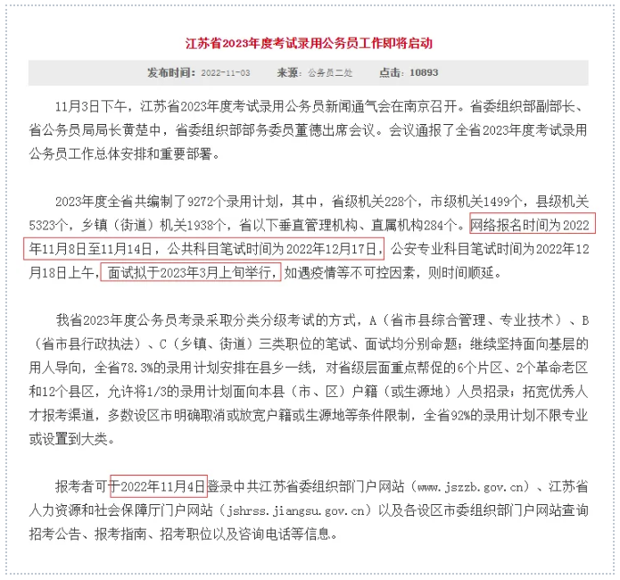 2023江蘇公務(wù)員考試消息已出,快來(lái)查收重要信息:招錄人數(shù):9272人,其中,省級(jí)機(jī)關(guān)228個(gè),市級(jí)機(jī)關(guān)1499個(gè),縣級(jí)機(jī)關(guān)5323個(gè),鄉(xiāng)鎮(zhèn)(街道)機(jī)關(guān)1938個(gè),省以下垂直管理機(jī)構(gòu)、直屬機(jī)構(gòu)284個(gè)。