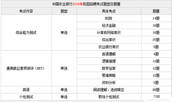 下圖為2016年農業(yè)銀行校園招聘考試題型及題量,考生可做參考。