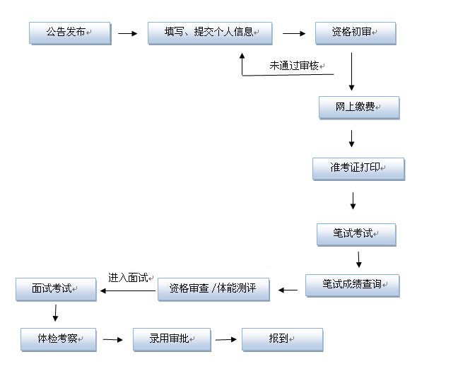 考試錄用工作按照制定錄用計劃、發(fā)布招考公告、報名與資格審查、筆試、資格復(fù)審、體能測評(人民警察職位)、面試、體檢與考察、公示、審批錄用等步驟進(jìn)行,由省公務(wù)員主管部門統(tǒng)一組織,有關(guān)工作由各市、省直管縣公務(wù)員主管部門和省直招錄機(jī)關(guān)具體組織實(shí)施。